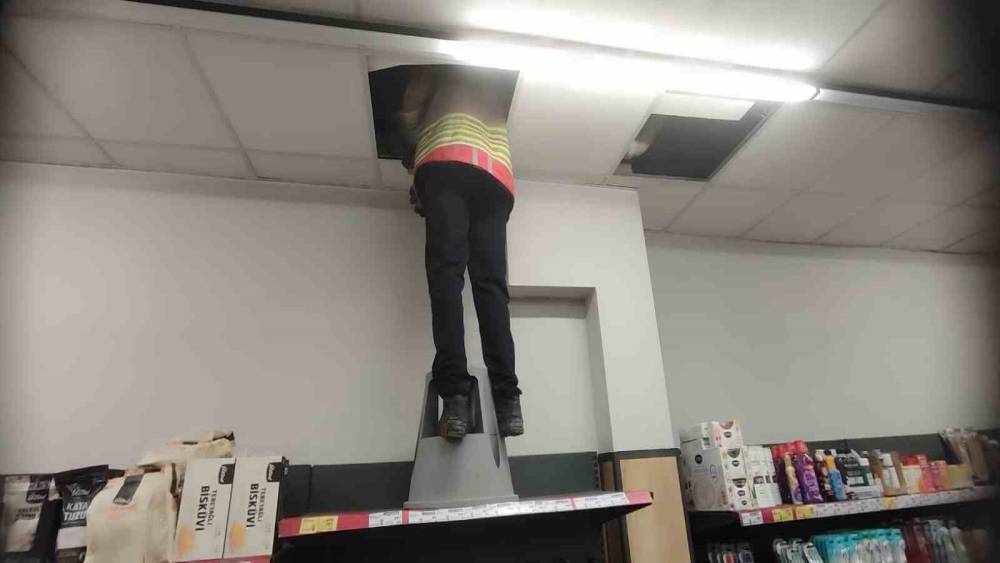 Hatay’da marketin havalandırma boşluğunda mahsur kalan kedi itfaiye ekiplerince kurtarıldı.