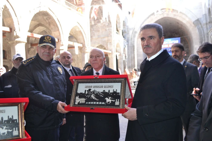 Erzurum’da Turizm Haftası’nın 50. yılı Çifte Minareli Medrese’de kutlandı; konuşmaların ardından protokol halka Erzurum helvası ikram etti.