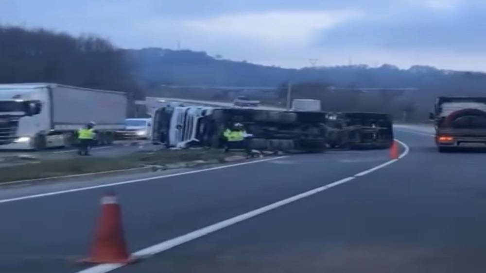 Düzce’de çimento yüklü tankerin devrildiği kazada 1 kişi yaralandı.