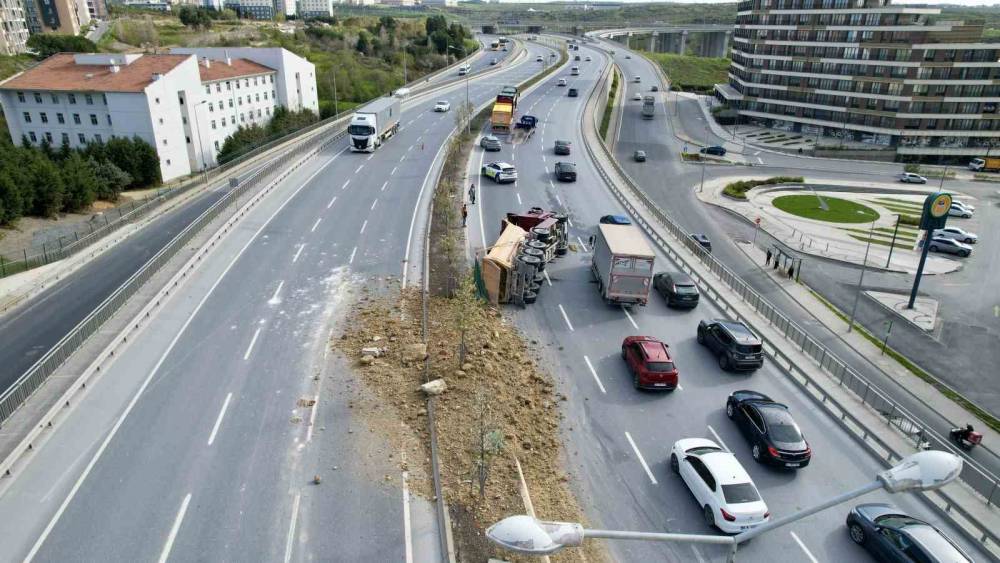 Başakşehir’de sürücüsünün direksiyon hakimiyetini kaybettiği hafriyat kamyonu devrildi. Dorsesindeki hafriyat toprağı yola saçılırken, kazada şans eseri yaralanan olmadı.