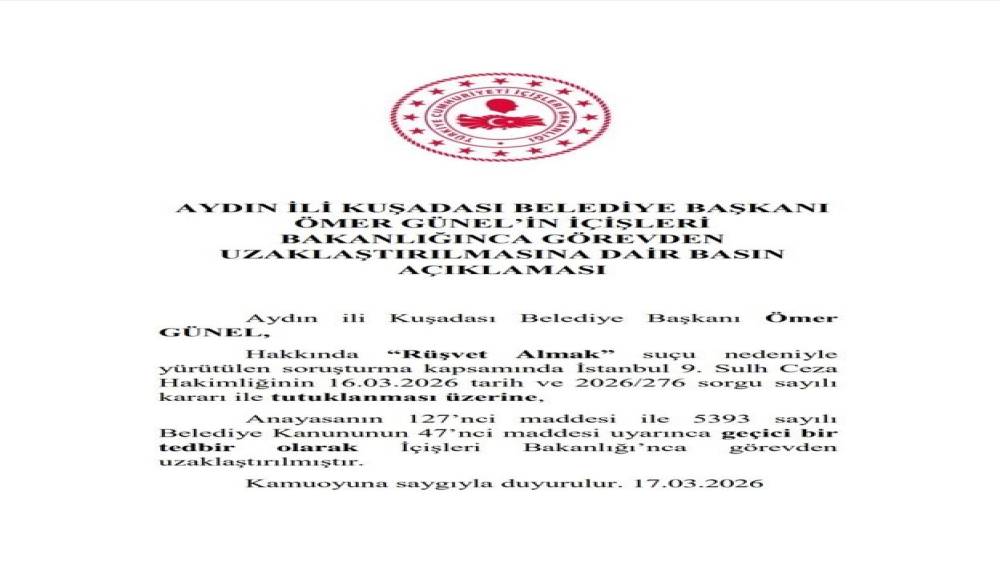 İçişleri Bakanlığı tarafından yapılan açıklamada, Aydın’a bağlı Kuşadası İlçe Belediye Başkanı Ömer Günel’in görevden uzaklaştırıldığı duyuruldu.İçişleri Bakanlığı tarafından yapılan açıklamada, Aydın’ın Kuşadası ilçesinin Belediye Başkanı Ömer Günel’in görevden uzaklaştırıldığı duyuruldu. Açıklamada, "Aydın ili Kuşadası Belediye Başkanı Ömer Günel hakkında ‘Rüşvet Almak’ suçu nedeniyle yürütülen soruşturma kapsamında İstanbul 9.Sulh Ceza Hakimliğinin 16.03.2026 tarih ve 2026/276 sorgu sayılı kararı ile tutuklanması üzerine, Anayasanın 127’nci maddesi ile 5393 sayılı Belediye Kanununun 47’nci maddesi uyarınca geçici bir tedbir olarak İçişleri Bakanlığı’nca görevden uzaklaştırılmıştır. Kamuoyuna saygıyla duyurulur" ifadeleri kullanıldı.
