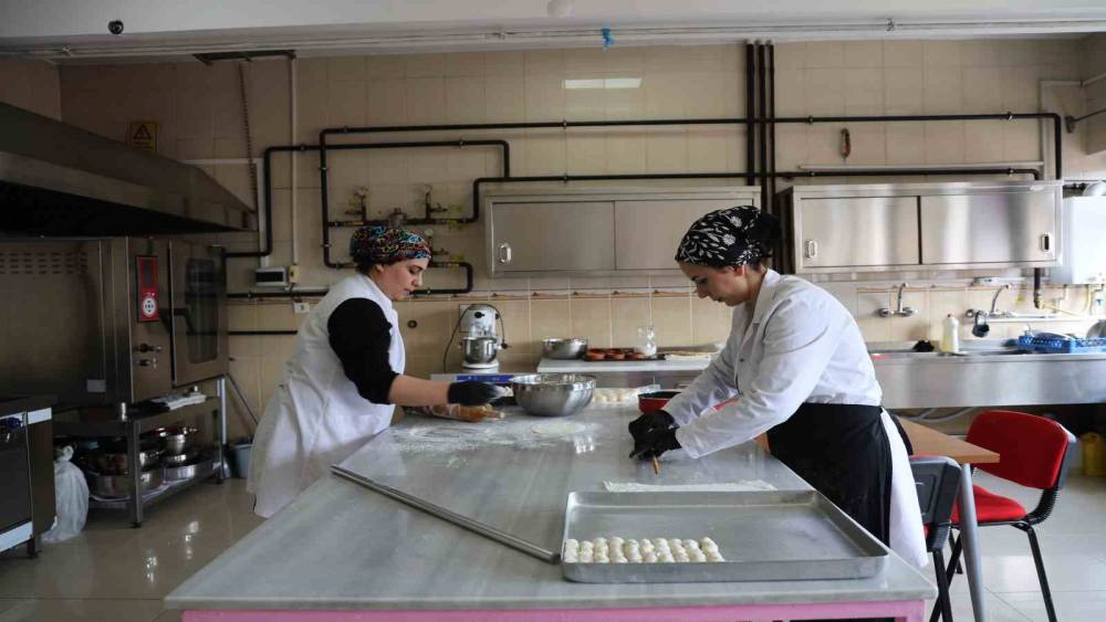 Diyarbakır Olgunlaşma Enstitüsü yiyecek içecek bölümünde Ramazan Bayramı için alınan tatlı ve çörek siparişleri, doğal malzemeler kullanılarak hazırlanıyor.