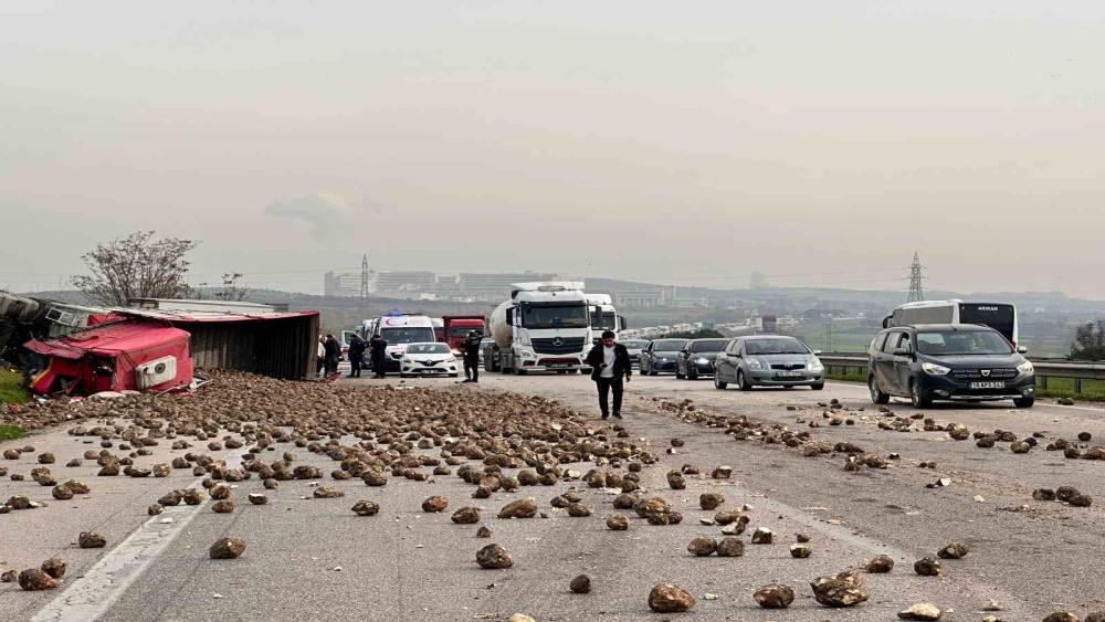 Şeker pancarı yüklü tır 2 araca çarpıp devrildi: 1’i ağır 5 yaralı