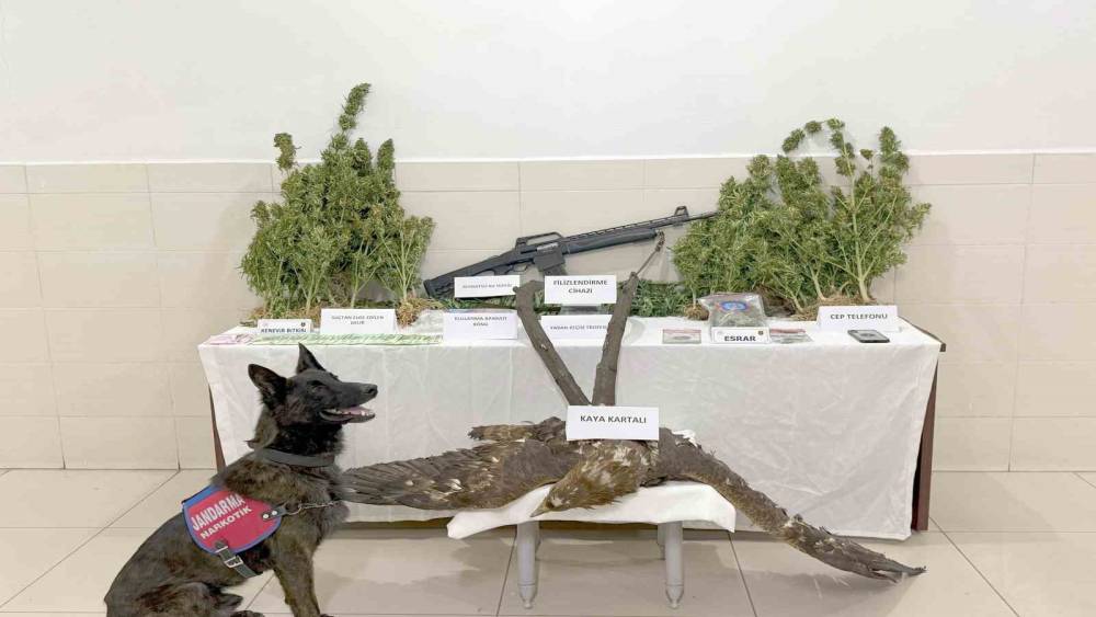 Tunceli’de jandarma tarafından yapılan uyuşturucu operasyonunda çok sayıda ve miktarda uyuşturucu maddenin yanı sıra kaçak avlanan kaya kartalı trofesi ve dağ keçisi boynuzu ele geçirildi.Tunceli İl Jandarma Komutanlığı KOM ve Asayiş birimleri tarafından Mazgirt ilçemiz Dallıbel köyünde uyuşturucu madde imal ve ticareti yaptığı tespit edilen İ.G.’nin ikametine operasyon düzenledi. Şüphelinin ev ve eklentilerinde; 50 kök kenevir bitkisi, 176 gram satışa ve kullanıma hazır kubar esrar, suçtan ele edilen 5 bin 900 Euro, 1 adet uyuşturucu üretiminde kullanılan filizlendirme/iklimlendirme aparatı, 1 adet ruhsatsız av tüfeği, 1 adet cep telefonu, 1 adet kaçak avlanan kaya kartalı trofesi, 1 adet kaçak avlanan dağ keçisi boynuzu, 300 metre sulama hortumu ve 1 adet bong olarak tabir edilen uyuşturucu kullanım aparatı ele geçirildi.Şüpheli hakkında uyuşturucu madde imal ve ticareti yanında kaçak avcılık suçundan da adli ve idari işlemlere başlanıldığı bildirildi.